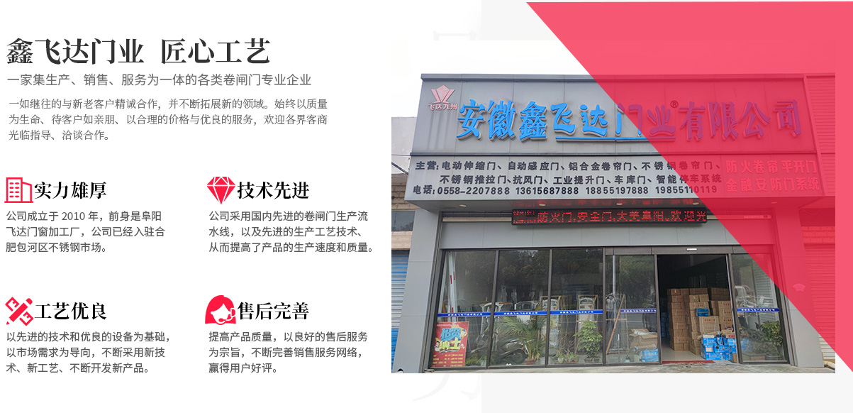 - 安徽鑫飛達(dá)門業(yè)有限公司成立于1998年,前身是阜陽飛達(dá)門窗加工廠,現(xiàn)在公司已經(jīng)入駐合肥包河區(qū)不銹鋼市場(chǎng)。本公司是一家集生產(chǎn)、銷售、服務(wù)為一體的各類卷閘門專業(yè)企業(yè)。公司采用國(guó)內(nèi)先進(jìn)的卷閘門生產(chǎn)流水線,以及先進(jìn)的生產(chǎn)工藝技術(shù)、從而提高了產(chǎn)品的生產(chǎn)速度和質(zhì)量。旗下?lián)碛酗w達(dá)九州和飛達(dá)門業(yè)兩個(gè)注冊(cè)商標(biāo)。 產(chǎn)品種類齊全 ,質(zhì)量可靠,主要有不銹鋼推拉門,防火卷簾門,電動(dòng)卷...